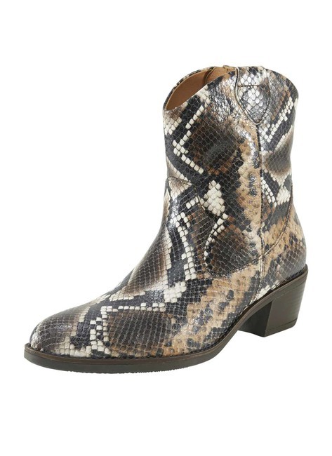 Kovbojský štýl de luxe so kvelou kombináciopu farieb a jemného koženého nappa materiálu v pytón vzhľade. Z vnútornej strany praktický zips. Vysoko kvalitný kožený interiér s ľahko polstrovanou stielkou. Kovová päta vytvára skvelý vzhľad. Syntetická podrážka. výška podpätku cca 4,5 cm