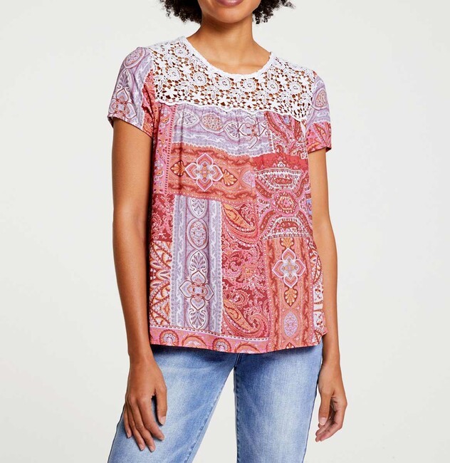 Krása z rúk dizajnéra. Táto blúzka šikovne spája eleganciu a jemnosť. Extravagantne vzorované vo farebnom vzhľade s módnym kvetinovým vzorom a jemným čipkovaným lemom. Voľný, postavu priliehavý strih, s krátkymi rukávmi. Okrúhly výstrih s gombíkmi vzadu pri krku. Priehľadná ramenná časť z vyšívanej čipky. Dĺžka 64 cm. Žiarivý materiál vyrobený zo 100% viskózy. Čipka: 100% polyester.
