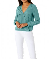 Módne, extravagantné, ale nie prehnane oblečené! Táto hodvábna blúzka je na pokožke neuveriteľne jemná a zaujme svojim elegantným leskom. Výstrih do V zafixovaný patentnými gombíkmi sa natiahne, ležérny zavinovací vzhľad ukrýva spolu s volánmi na ramennom seme vpredu a rozširujúcim sa záhybom vzadu, ako aj dlhším zaobleným spodným lemom vzadu. Ramienka na pleci a vrecká s chlopňou na hrudi dodávajú športové akcenty. Dlhé rukávy s manžetami na gombíky. Lesklé strieborné bižutérne gombíky. Hravá silueta. Dĺžka 66/69 cm. Ušľachtilý padavý krep vyrobený zo 100% hodvábu.