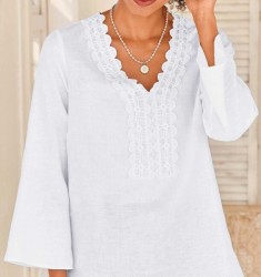 Stylingová kráľovná. Táto dámska blúzka od návrhárky je štýlovým spoločníkom na mnohé príležitosti. Kvalitná ľanová blúzka s typickou jemnou vráskou, príjemne vzdušná a priedušná. Voľný áčkový tvar s mierne rozšírenými 7/8 rukávmi a krabicovým záhybom vzadu pre väčšiu šírku. Výstrih do V s elegantným tónovaným čipkovaným lemom a zaobleným spodným lemom. Dĺžka 72 cm. 100% ľan.