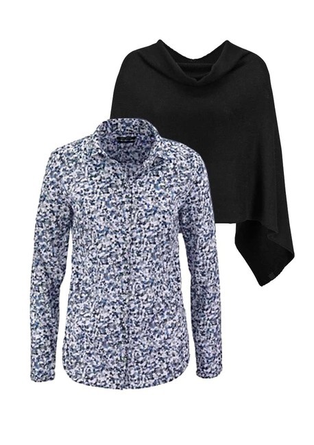 Atraktívna blúzka-košeľa Marco OPolo so skvelou potlačou v bielo-šedo-čierno-modrej farbe a nádherne mäkkým pleteným pončom v čiernej farbe. Logo na spodnej strane lemu. Asymetricky strihané pletené pončo s jemne padajúcim golierom, ozdobným rohovým lemom a tónovaným koženým logom. dĺžka blúzky cca 74 cm, dĺžka ponča od cca 49 do cca 71 cm.blúzka zo 100% bavlny, pletená pončo vyrobené z 37% viskózy / 30% bavlny / 18% polyamidu / 10% vlny / 5% kašmíru
