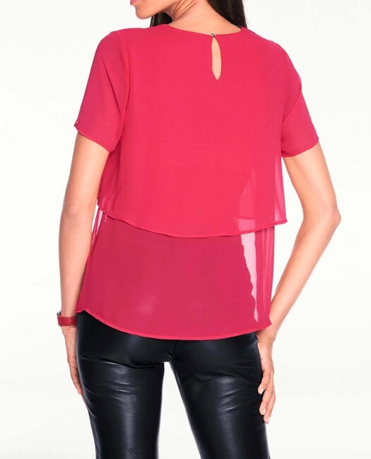 Jednoducho nádherné! Sen z jemného priehľadného šifónu vás zahalí do krásy a ležérnej elegancie. V trendovom vrstvenom vzhľade, čiastočne priehľadný. Priliehavé postave s klasickým okrúhlym výstrihom, úzkym rozparkom s gombíkom vzadu pri krku a krátkymi rukávmi.Dĺžka 64 cm (veľkosť 38). Jemne padavý šifón vyrobený zo 100% polyesteru.