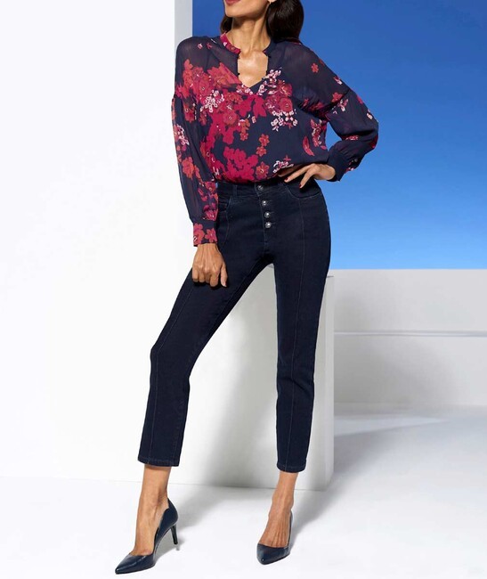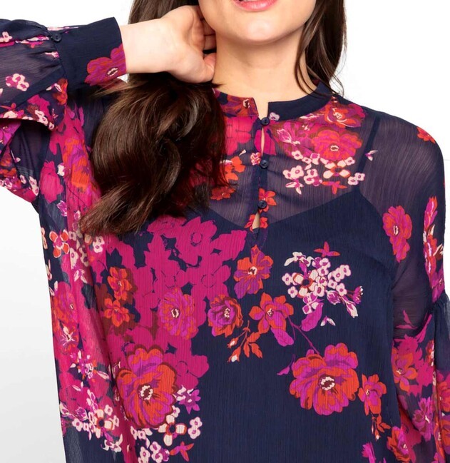 Univerzálny génius, ktorý miluje kombinácie a má elegantný postoj. Elegantná blúzka s kvetovanou potlačou v priehľadnej kvalite s jemným strihom. Módne riasenie na bokoch a prestrihnuté ramená. Okrúhly výstrih s rozparkom a gombíkovou légou. Dlhé rukávy s manžetami na gombíky. Elastický pás vzadu pri krku. S oddeleným topom. Šifón vyrobený zo 100% polyesteru. Vrchná časť: 97 % polyester / 3 % elastan. Dĺžka 68 cm.