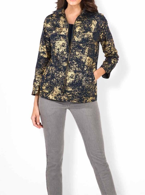 Individualita, dynamika, trieda a šik nie sú protirečenie, ale recept na úspech tohto kúsku! Každá časť je jedinečná! Ležérna bluzónová bunda s čiastočne lesklou celoplošnou potlačou zlatej fólie urobí každého očarí. Detaily ako patentky a zipsy sú tiež zlatej farby. Pre tento štýl sú typické pútka so zapínaním na patentky na stojačiku, na pleciach a na leme. V stálej kvalite so zipsom po celej dĺžke, dvoma šikmými vreckami na zips, 1 ozdobným zipsom vo výške hrudníka a patentkami na konci rukávov. Tvarované švy a ramenné strmene vpredu a vzadu zaisťujú dokonalé padnutie. Vysokokvalitná 100% bavlna. Dĺžka 70 cm.