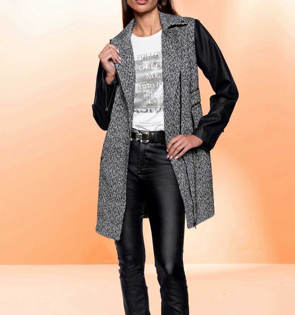 Avantgardný kúsok s luxusným nádychom! Nádherne extravagantná dlhá bunda s čierno-bielym štruktúrovaným vzorom, asymetrickým zipsom a vreckami na zips. Zvýrazňuje pás s módnym vzhľadom opasku. Klopový golier, možno nosiť aj ako stojačik. Dlhý rukáv z mäkkej imitácie kože so zapínaním na zips podčiarkuje ležérny štýl. Lemovanie z imitácie kože na zipsoch a opasku. Rovný tvar. Dĺžka 86 cm. Teplá, vlnená kvalita vyrobená zo 73 % polyesteru / 13 % polyamidu / 12 % viskózy / 2 % vlny. Rukávy 100% viskóza, 100% polyuretánová vrstva. Podšívka vyrobená zo 100% polyesteru