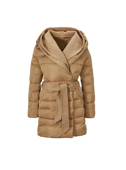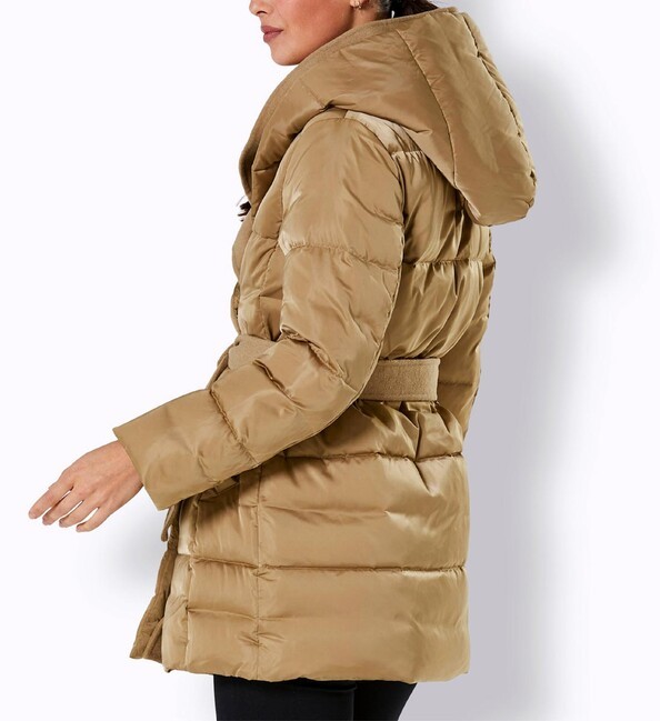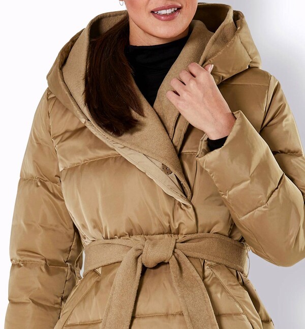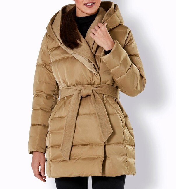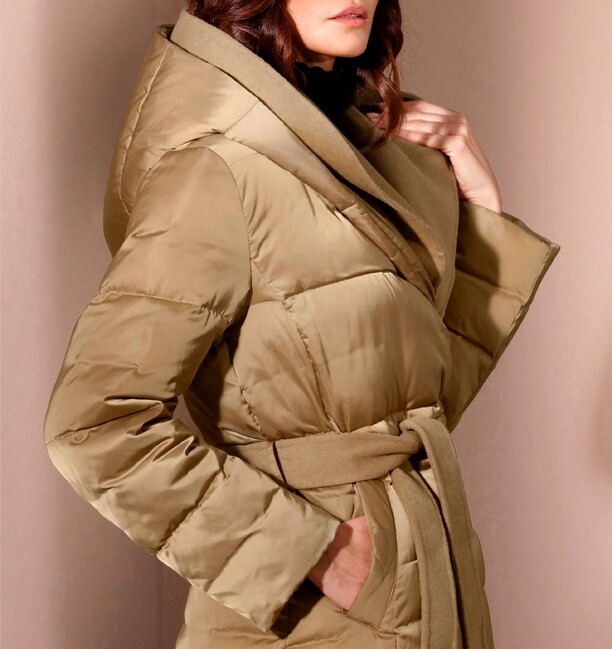 Páperová bunda z nápadne krásnej materiálovej zmesi. Nádherne ľahká a výnimočne teplá vďaka luxusnej výplni z páperia a peria. Vlnená odnímateľná vsadka v bohato vystuženej kapucni a pozdĺž skrytého zapínania na patentný cvok vpredu umocňuje jej exkluzivitu. Má odnímateľný opasok so zaväzovaním zo zmesi vlny, dve bočné vrecká a kvalitný interiér s podšívkou s potlačou loga. Kovová retiazka slúži ako pútko na zavesenie. Prešívaná a teplo vyplnená 90 % páperia a 10 % peria. Vrchná látka a podšívka sú zo 100 % polyesteru, zatiaľ čo lemovanie je zo 70 % polyesteru a 30 % merino vlny. Dĺžka 82 cm. Rozmery pri veľkosti 46 - obvod prsia 126cm, obvod pása 122cm, obvod bokov 140cm, dĺžka rukáva 61cm, celková dĺžka 85cm.Výrobca: AproductZ GmbH, Adresa: Werner-Otto-Straße 1-7, 22179 Hamburg, Nemecko, Email: customer-service@aproductz.com
