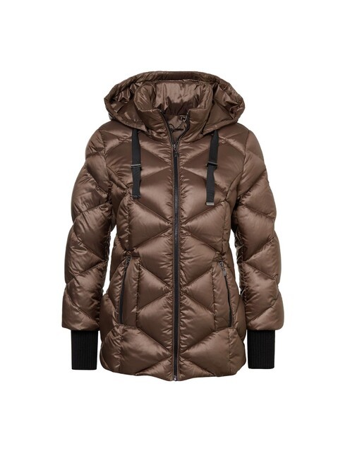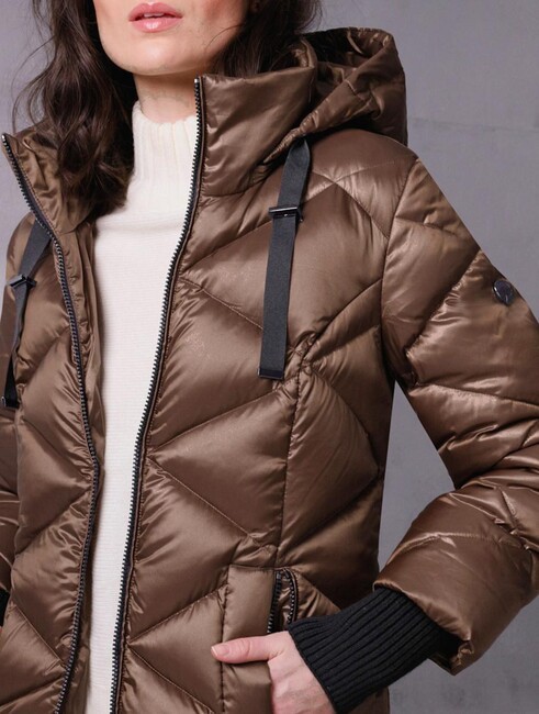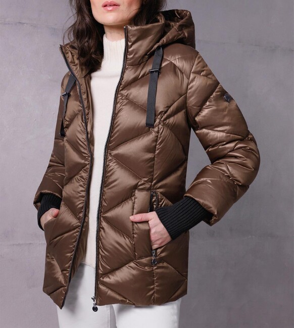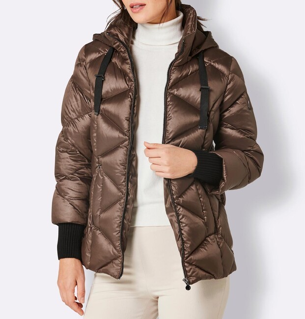 Luxusná zimná móda! Elegantná páperová bunda s vysoko kvalitnou výplňou z tepelnoizolačného páperia a peria. Moderné prešívanie a efektný trblietavý dvojfarebný vzhľad. S polstrovaným, vysokým stojačikom, odnímateľnou, nastaviteľnou kapucňou a zipsom (s prekrytím). Bočné vrecká na zips. Rukávy s pletenými manžetami pre ochranu pred vetrom. Prepracované vnútro s podšívkou s potlačou loga, kontrastným lemovaním, kovovou retiazkou na zavesenie a vreckom na zips. Elegantné, lesklé doplnky s reliéfnym logom. Vrchný materiál: 55 % polyester/45 % polyamid. Výplň: 90 % páperie/10 % perie. 100 % polyester. Dĺžka 70 cm. Výrobca: AproductZ GmbH, Adresa: Werner-Otto-Straße 1-7, 22179 Hamburg, DE, Email: customer-service@aproductz.com