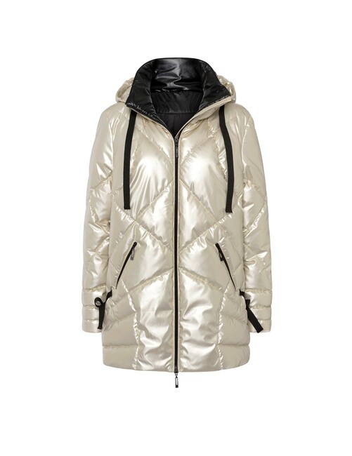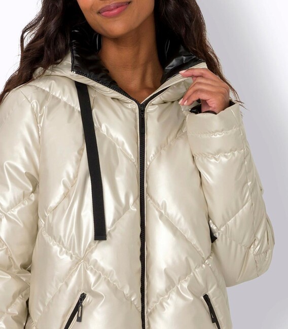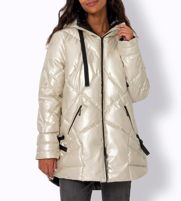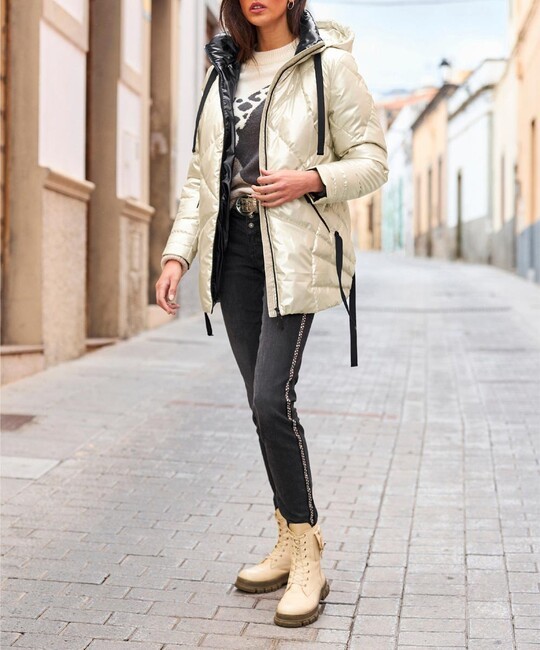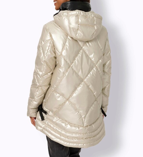Váš nový obľúbený kúsok – vo vzrušujúco extravagantnom štýle! Bunda s výrazným prešívaným vzorom so sofistikovaným metalickým leskom a kontrastnou podšívkou. Stojatý golier s kapucňou. Dlhé rukávy. Praktický obojsmerný zips a vrecká na zips. Bočné zaväzovanie. Módne predĺžený strih vzadu. Približne 78/83 cm. Útulná a teplá výplň. Vrchná látka, podšívka a výplň zo 100 % polyesteru.Výrobca: AproductZ GmbH, Adresa: Werner-Otto-Straße 1-7, 22179 Hamburg, Nemecko, Email: customer-service@aproductz.com