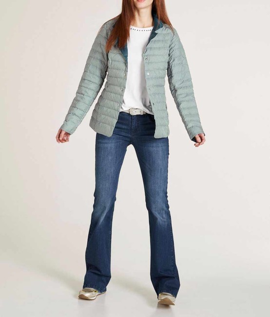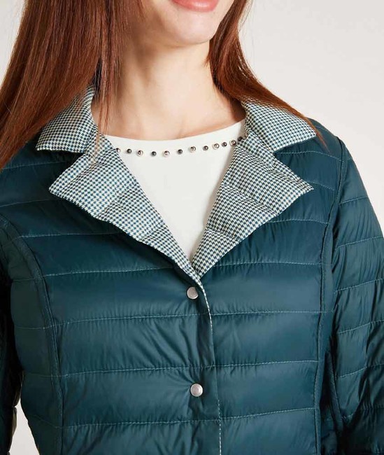 Prešívaná páperová bunda v extravagantnom mestskom štýle na každý deň. Obojstranná z jednej strany so štýlovým všestranným vzorom kohútej stopy a druhá strana jednofarebná. Priliehavá postave s elegantnou fazónou, légou na patenty a 2 vreckami. Viedenské švy garantujú ideálny tvar. Dlhé rukávy. Predné zaoblené okraje lemu. dĺžka 71 cm, vysoko kvalitný materiál vyrobený zo 100% polyesteru, výplň zo 90% páperia / 10% perie, vnútro vyrobené zo 100% polyamidu