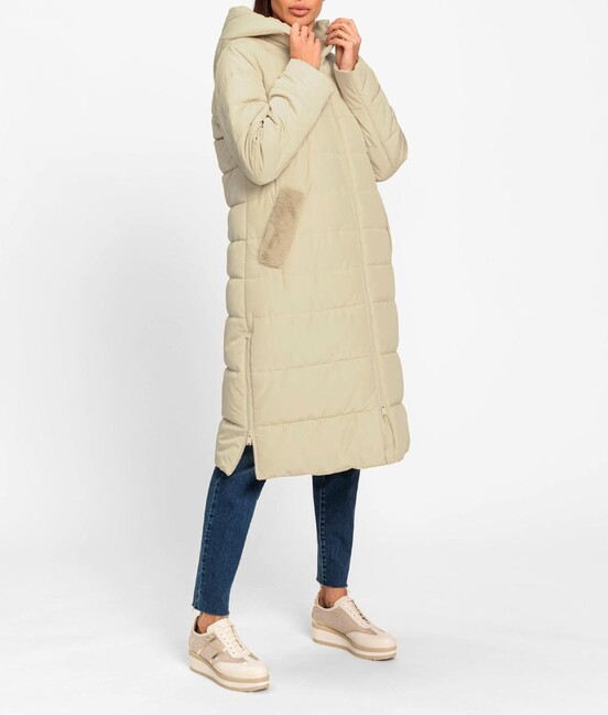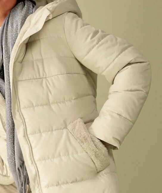 Sofistikovaný kabát, dokonale vybavený vynikajúcimi detailmi, ideálny na chladnejšie mesiace. Tento útulný prešívaný kabát sa vyznačuje vizuálne zoštíhľujúcim prešívaným vzorom. Má kapucňu, obojsmerný zips a bočné vrecká so zapínaním na patentný patent. Ďalším prvkom je mäkká podšívka z umelej kožušiny v hornej časti a na vreckách na ruky. Bočné rozparky so zipsami poskytujú dodatočnú voľnosť pohybu. Vyrobený z recyklovaného polyesteru. Vrchná látka + umelá kožušina: 100 % polyester. Výplň: 100 % polyester. Podšívka rukávov: 100 % polyester. Dĺžka106 cm. Doporučujeme objednávať o číslo menšie.Rozmery pri veľkosti 38 - obvod prsia 114cm, obvod pása 122cm, obvod bokov 128cm, dĺžka rukáva 60cm, celková dĺžka 107cm.Rozmery pri veľkosti 40 - obvod prsia 118cm, obvod pása 124cm, obvod bokov 132cm, dĺžka rukáva 60cm, celková dĺžka 109cm.Výrobca: AproductZ GmbH, Adresa: Werner-Otto-Straße 1-7, 22179 Hamburg, Nemecko, Email: customer-service@aproductz.com