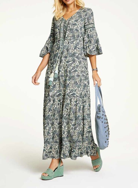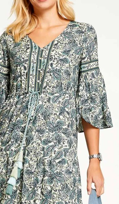 Hippie štýl de luxe! Nádherne romantické maxi šaty od Linea Tesini v módnom stupňovitom vzhľade a pôsobivej paisley potlači. Ozdobná gombíková léga s trblietavými perleťovými gombíkmi vo výstrihu do V. Široké 3/4 rukávy s vnútorným rozparkom a hravým nariaseným spodným lemom. Silueta obopínajúca postavu s integrovaným sťahovacím pásom a ozdobnou šnúrkou na zaväzovanie so strapcovými detailmi, ako aj zvonová sukňa s volánovým spodným lemom. Odnímateľná spodnička s nastaviteľnými špagetovými ramienkami. Dĺžka 140 cm (veľkosť 40). Príjemná, mäkká kvalita vyrobená zo 100% viskózy, spodnička zo 100% bavlny.