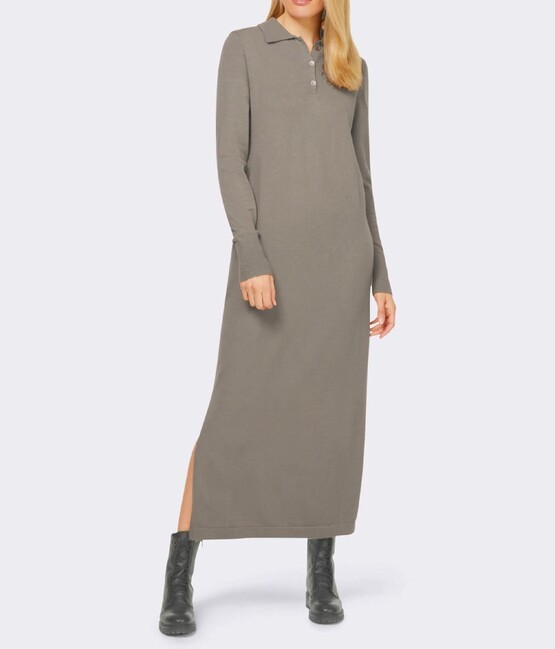 Ušľachtilý materiál a dôrazne módny zmysel pre štýl vytvárajú fascinujúcu zmes v tejto dizajnérskej kreácii, pretože s týmito elegantnými maxi pletenými šatami je zaručený športový vzhľad! Nádherný jemný úplet s mäkkým pocitom vyrobený z 50% viskózy/28% polyesteru/22% polyamidu. Športový polo golier. Výstrih s krátkou gombíkovou légou. Dlhé rukávy s manžetami. Rovná forma. Bočné rozparky. Dĺžka 126 cm.