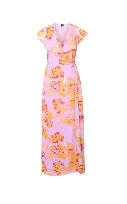 Nápaditý štýl vyžaruje čistú radosť zo života. Očarujúce maxi šaty s tropickým kvetinovým vzorom. Mimoriadne ženské v trendovom zavinovacom dizajne s dlhými zaväzovaním. Špicatý výstrih so živým volánovým lemom. Priliehavé postave. Dĺžka 136 cm. Padavý šifón a džersejová podšívka zo 100% polyesteru.