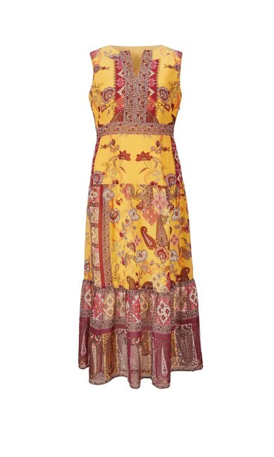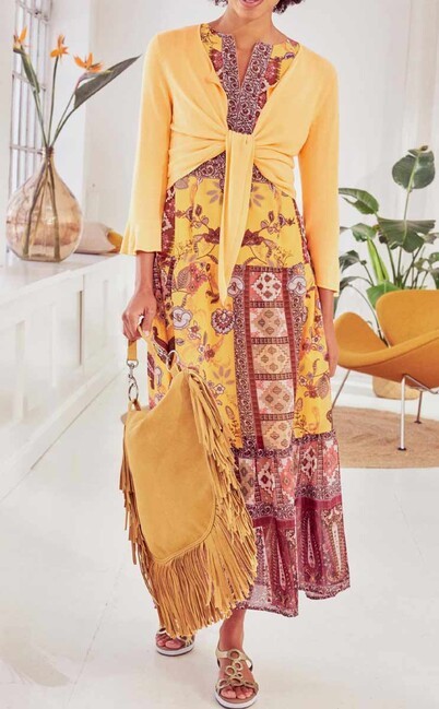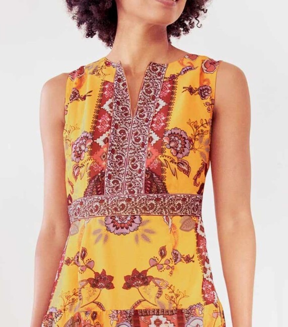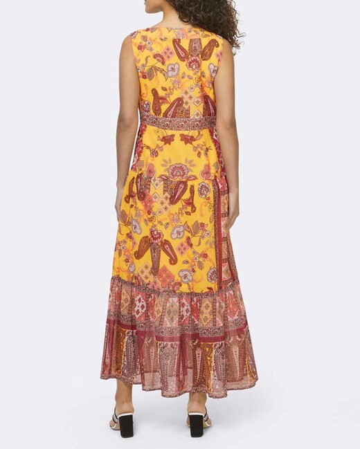Vášnivo inscenovaný model s temperamentnou hrou farieb. Elegantné maxi šaty s ozdobnými kontrastnými vsadkami v dekolte a páse. Nádherný, letný dizajn. Sukňová časť v módnom vrstveným spracovaní. Volány na leme. Štýl s okrúhlym výstrihom bez rukávov s V výstrihom. Rozšírený lem. Dĺžka 132 cm. Jemný šev na zips na boku až po boky. Príjemné nosenie, živá krepová kvalita vyrobená zo 100% polyesteru. Nepriehľadná podšívka zo 100% bavlny.