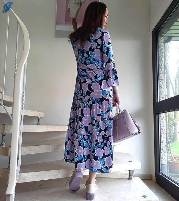 Pôvabné šaty vo vysoko módnej farebnej kombinácii sú úžasne ženské a hravé. Atraktívny košíčkový výstrih zakončený gombíkovou légou po pás. Módne zvýšený pás s pripojenou stupňovitou sukňou v rozšírenom vzhľade. Rukávy s veľkorysými volánmi. Dĺžka 130 cm. Mimoriadne mäkká splývavá kvalita vyrobená zo 100% viskózy.
