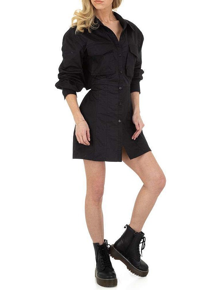 Dámske elegantné mini šaty v čiernom prevedení. modelka je vysoká 169 cm a má veľkosť S náprsného vrecka košeľový štýl
