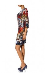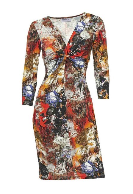 Elegantné šaty s 3/4 rukávom, v decentnej dĺžke. Šaty sú ozvláštnené zaujímavým vzorom a netradične riešeným dekoltom. Nadčasový kúsok do práce i na posedenia s priateľmi. Materiál: 95% polyester, 5% elastan. Spevňujúca vložka na prsiach: 85% polyamid, 15% elastan. Podšívka 100% polyester. Dĺžka cca 94 cm.