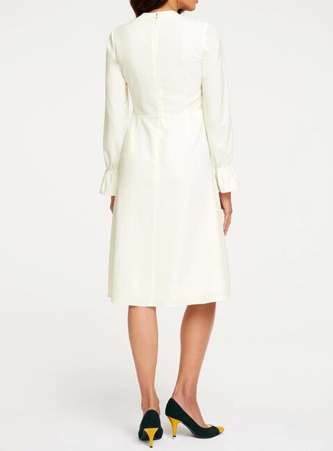 Žiarivo krásne šaty od Ashley Brooke v elegantnom tóne šampanského. Top priliehajúci k postave s úzkym stojačikom, zapínaním na dva gombíky pri krku a prepracovaným výstrihom v oblasti dekoltu. Predné sedlo v páse a tvarujúce prsné záševky. Dlhé rukávy s trendovými volánovými koncami. Vzadu jemný zips. Mierne rozšírená sukňa šikovne zdôrazňuje ženský vzhľad.Dĺžka 108 cm. Jemne padavá kvalita z 94% polyesteru/6% elastanu, podšívka zo 100% polyesteru.