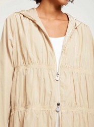 Ležérny a módny plášť s kapucňou zaujme s trendovými detailmi. Šikovne prešívaná predná časť s efektne nariasenými elastickými detailmi. Priliehavá, rozšírená silueta s obojsmerným zipsom, 2 bočnými vreckami s bezšvovým zipsom a dlhými rukávmi. zadný golier. Predĺžený chrbát so zaobleným lemom.Dĺžka 103/114 cm. Mierne lesklá kvalita vyrobená zo 100% polyesteru, podšívka zo 100% polyesteru.