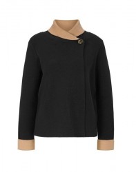 Štýlová v tomto kardigáne! Dvojfarebný dizajn s čiernou vonkajšou stranou a ťavou farbou vo vnútri je veľmi šikovný. Avantgardný kardigán v blejzrovom prevedení v zavinovacom tvare s golierom a veľkým gombíkom s leopardím vzorom. Dlhé rukávy s pevnou manžetou. Teplý, mäkký úplet vyrobený zo 45 % viskózy / 35 % polyamidu / 20 % polyesteru. Rovná forma. Dĺžka 58 cm.