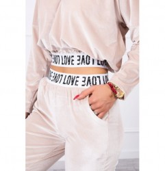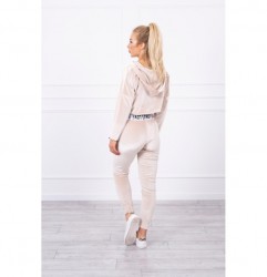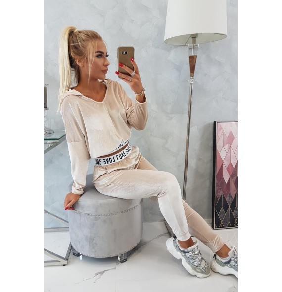 Predstavujeme vám sadu mikín a nohavíc. Súprava je vyrobená z velúru. Mikina s kapucňou a výstrihom do V. V spodnej časti mikiny je našitá páska s nápisom. Nohavice s vreckami a pásom v páse. Súprava je vyrobená z vysoko kvalitného materiálu. Veľkosť je univerzálna a bude vhodná pre dámy vo veľkostiach S, M alebo L.