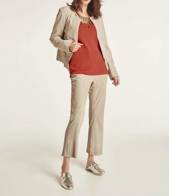 Be smart and sophisticated! Diese traumhaft weiche, figurbetonte Hose von Heine in angesagter 7/8-Länge verleiht Ihrem Auftritt eine finale Nuance Klasse und Stil. Gefertigt aus geschmeidigem Ziegenveloursleder mit angesetztem Bund, verdecktem Haken/Ösen-Verschluss und Reißverschluss. Leistentasche vorn und Fake-Gesäßtasche hinten. Gerades, geschlitztes Hosenbein. Beinschrittlänge ca. 62 cm. Futter aus 100% Polyester. Enthält nichttextile Teile tierischen Ursprungs.