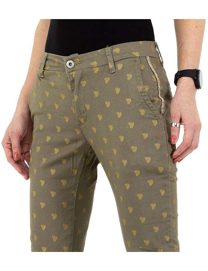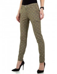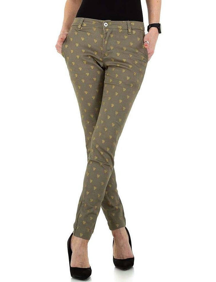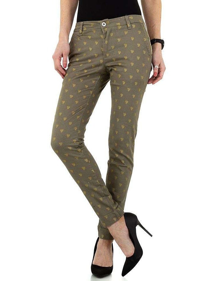 Dámske vzorované nohavice v khaki prevedení. modelka je vysoká 169 cm, konfekčnú veľkosť XS, na fotografii má na sebe veľkosť 34