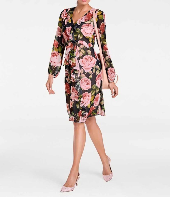 Silný trend s novým módnym impulzom. Očarujúce šifónové šaty s letnou farbou, prekrásnou kvetinovou celoplošnou potlačou a sofistikovanými detailami. Nádherná dizajnérska tvorba s očarujúcimi volánmi - ideálne na leto. Top s V-dekoltom, dlhé, priehľadné balónikové rukávy s elastickým lemom a jemným švom, bočný zips. Bočné švy s integrovaným zadným elastickým pásom. dĺžka cca 99 cmpriehľadná šifónová kvalita vyrobená zo 100% polyesteru, podšívka zo 100% polyamidu