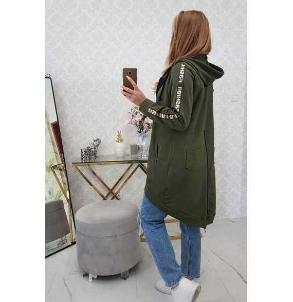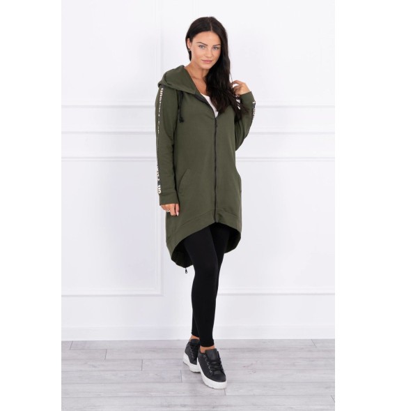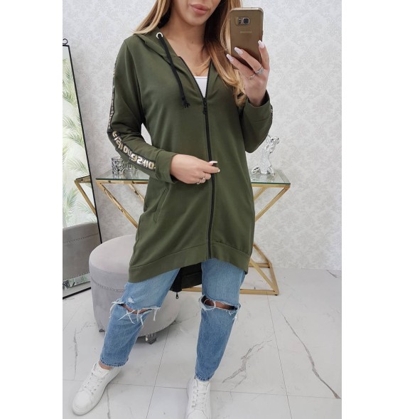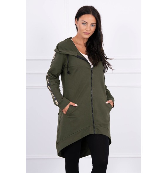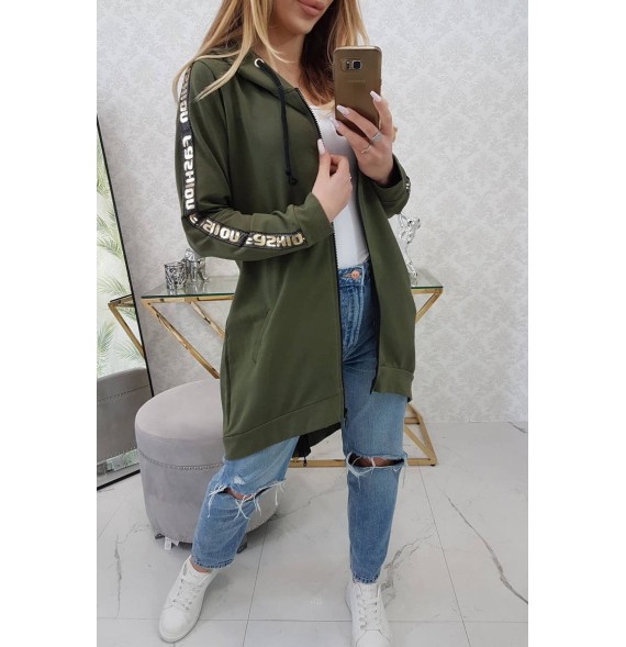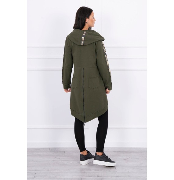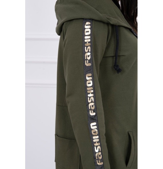 Mikina má našité pásky s nápisom.
