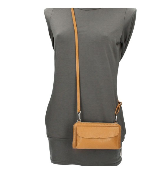 Kožená peňaženka s púzdrom na mobil. Obsahuje vrecko na mince so zapínaním na zips a priehradky na bankovnky. Na prednej strane je puzdro na mobil so zapínaním na magnetickú sponu. 100% MADE IN ITALY.