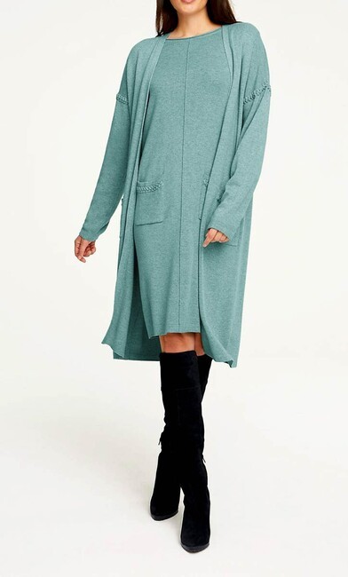 Láskyplne inscenovaný pletený kardigán s prepracovanými pletenými pásikmi na rukávoch a našitými vreckami. Objímajúci postavu, tvar bez zapínania. Dĺžka 108 cm. Teplá a úžasne mäkká kvalita vyrobená zo 45% viskózy/27% bavlny/25% polyamidu/3% kašmíru.