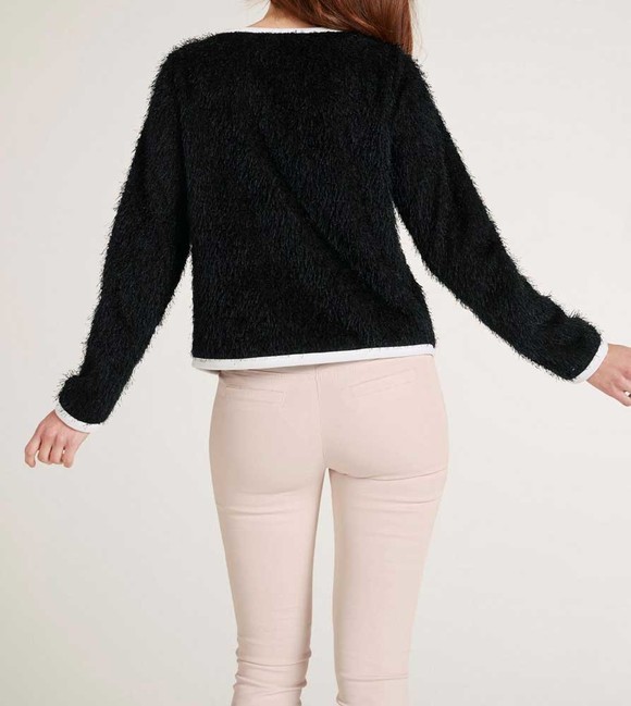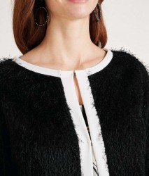 Očarujúco kombinovaný sveter vyrobený z našuchorenej efektnej priadze s výraznými kontrastnými lemami. Krátky tvar s klasickým okrúhlym výstrihom, zapínaním na háčiky a dlhými rukávmi. dĺžka cca 62 cmnadýchaná kvalita úpletu zo 100% polyesteru, lemovka vyrobená z 95% polyester / 5% elastan