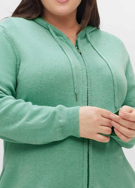 Cíťte sa dobre! Mäkký plyšový kardigán od Sheego sa zapína na ležérny 2-cestný zips a voľne obopína siluetu. Bočné vrecká a cool kapucňa so sťahovacou šnúrkou dokonale dopĺňajú ležérny štýl. Rebrované lemovanie. Dĺžka 80 cm. Teplý, mäkký úplet vyrobený z 50 % viskózy / 26 % polyamidu / 24 % polyesteru.