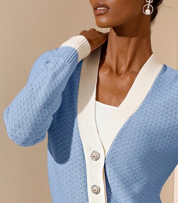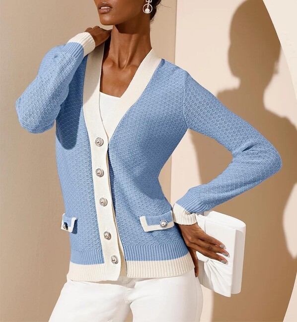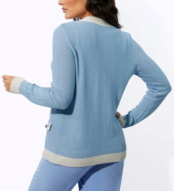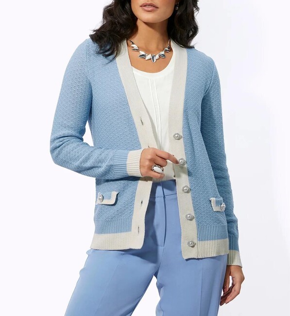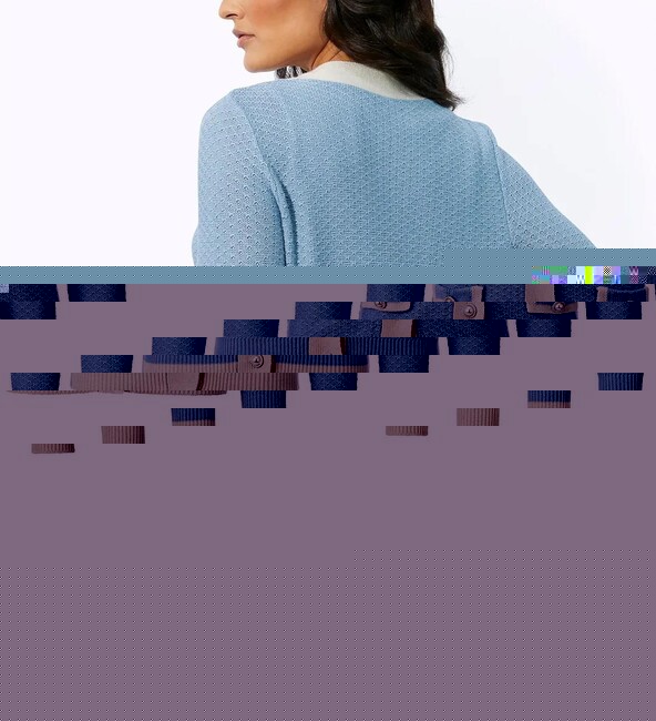 Nadčasový, klasický a krásny: priliehavý kardigán z exkluzívnej a pohodlnej kvalitnej zmesi vlny a hodvábu. Hlboký výstrih do V opticky predlžuje postavu. Medzi pútavé detaily patrí kontrastný lem pozdĺž ozdobnej perleťovej gombíkovej légy, na dvoch ozdobných klopách s gombíkmi s perleťovým efektom, na koncoch dlhých rebrovaných manžiet a na rebrovanom leme. Mäkký, jemný úplet vyrobený z 55 % lyocellu, 25 % polyakrylu, 10 % hodvábu a 10 % vlny. Dĺžka 62 cm. Výrobca: AproductZ GmbH; Adresa: Werner-Otto-Straße 1-7, 22179 Hamburg, Nemecko; E-mail: customer-service@aproductz.com