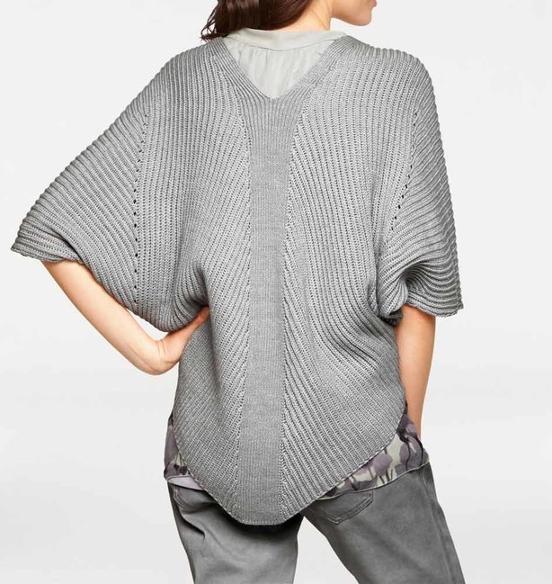 Príjemne mäkký kardigán z rebrovaného úpletu ležérneho oversized tvaru. Výstrih v tvare V, módne 3/4 rukávy v trendovom netopierom vzhľade a zaväzovanie na zapínanie saka. Vzadu dlhšie ako vpredu. Dĺžka 49/70 cm. Teplá kvalita vyrobená z 30% merino vlny/70% polyakrylu.
