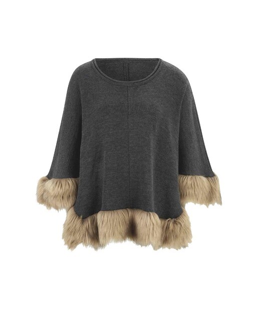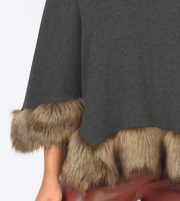 Rozmarná pocta ženskosti. Prepracované ležérne pončo s pôsobivými detailmi. Všestranný kombinačný talent s netopierími rukávmi v 3/4 dĺžke, okrúhlym výstrihom a bujným, nadýchaným lemom z umelej kožušiny na leme. Dĺžka 70 cm. Vysoko kvalitný hrejivý úplet a umelá kožušina zo 100% polyakrylu.