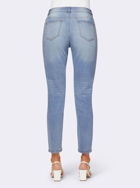 WOW! Neformálne a nápadné, skutočný favorit pre módne kombinácie. Absolútne trendy džínsy v modernom 5-vreckovom štýle s trendy vyšúchanom vzhľade. Trblietavý ozdobný pásik pozdĺž bočných švov upúta pozornosť. Dve našité vrecká na zadnej strane. Ležérny mrkvový tvar. Normálna výška sedu. Pohodlný strih. Šírka chodidla 32 cm. Vnútorná dĺžka nohavíc 71 cm Prvotriedna riflovina z 99% bavlny/ 1% elastanu.