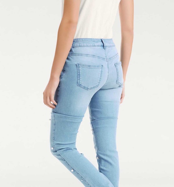 Univerzálne, kombinovateľné a úžasne ženské džínsy z dielne Patrizia Dini s perlami. Ozdobné perlové vyšívanie na prednej časti nohavíc. Mierne znížený vzostup a úzke stehno. dĺžka nohy cca 69 cm pohodlná denimová kvalita z 98% bavlny / 2% spandexu