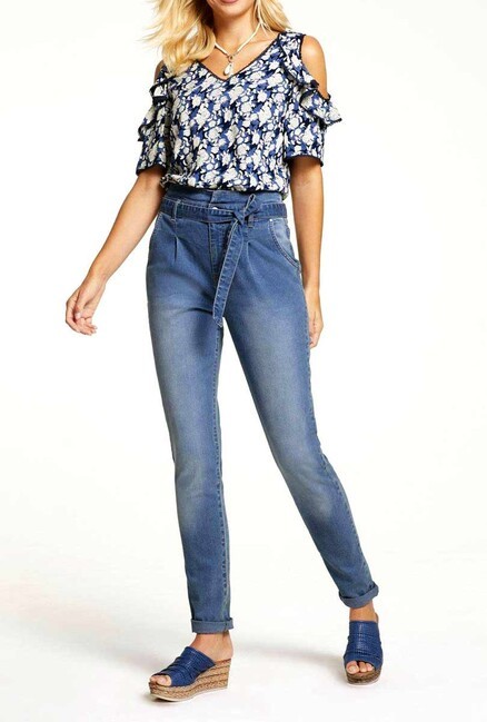 Tento štýl má všetko! Skvelé džínsy od Linea Tesini s vysokým pásom s pútkom na opasok v štýle papierovej tašky a zodpovedajúcim zaväzovacím opaskom. V ležérnom použitom praní a trendy mrkvovom tvare s ozdobným prešívaním v kontrastnej farbe a sofistikovaným záhybom. Bočné vrecká a zadné vrecká. Zapínanie v páse na gombík a zapínanie na skrytý zips. Sedlo vzadu zaistí krásny zadok zadok! Pohodlný strih.Vnútorná dĺžka nohavice 75 cm (veľkosť 38). Elastická džínsovina vyrobená zo 76% bavlny (Bavlna vyrobená v Afrike)/16% polyesteru/7% viskózy/1% elastanu.