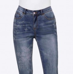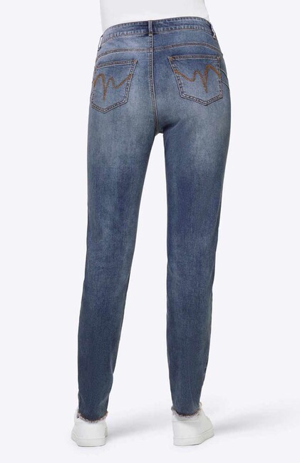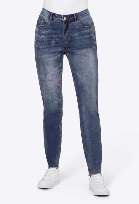 Zaujímavé džínsy, ktoré musíš mať! Ležérne džínsy v trendovom 5-vreckovom štýle s optimalizačným push-up efektom a ležérnym vyšúchaným vzhľadom. Tvarovaný pás s pútkami na opasok. Úzka nohavica atraktívne paisley detaily a ozdobné kamienkové ozdoby, ako aj strapce na leme vytvárajú ďalšie vizuálne zvýraznenia. Šírka chodidla 30 cm. Vnútorná dĺžka nohavíc 71 cm. Vysoko kvalitný strečový denim vyrobený z 98% bavlny / 2% elastanu.
