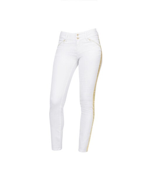 Tieto lichotivé výrazné strečové džínsy v elegantnej kombinácii krémovej a zlatej vnesú do vášho letného vzhľadu cool vibrácie. Nápadné džínsy v kvalitnej keprovej kvalite s vysokým percentom streču – perfektne padnú a sú pohodlné. Široký pás s gombíkom a zipsom, pútka na opasok a 4-vreckový dizajn s 2 vreckami na zips vpredu a 2 našitými vreckami vzadu. Noha je opticky natiahnutá predným bočným švom a galónovým pruhom s fóliovou potlačou zlatej farby. Trvalé lisovanie vrások v slabinách. Mierne nižší rast, štíhle stehná, úzke členky. Šírka chodidla 32 cm. Strečový denim vyrobený z 96% bavlny / 4% elastanu. Vnútorná dĺžka nohavíc 77 cm.