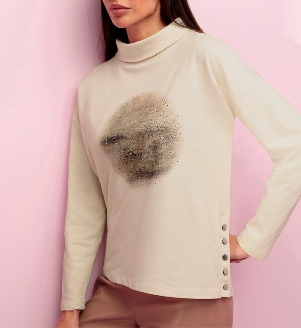 Ľahký štýl je môj luxus! Extravagantná potlačená košeľa s cool detailmi. S moderným rolovaným výstrihom a ležérne spadnutými ramenami. Dlhé rukávy. Pútavá potlač s kamienkami na prednej strane. Bočné rozparky s ozdobnými patentnými gombíkmi. Podporuje iniciatívu Bavlna vyrobená v Afrike. Mäkký džersej vyrobený zo 100 % bavlny. Dĺžka 66 cm.Výrobca: AproductZ GmbH, Adresa: Werner-Otto-Straße 1-7, 22179 Hamburg, Nemecko, Email: customer-service@aproductz.com