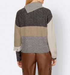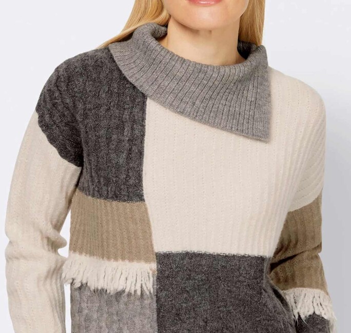 Luxusný módny partner s absolútnym wow efektom.Elegantný pulóver v trendovom Patchwork mixe. S rolákovým rozparkom na jednej strane a cool strapcami. Štýl s dlhým rukávom a padnutými ramenami. Mäkké, teplé a nenáročné na údržbu vyrobené zo 78% polyakrylu/22% polyesteru. Dĺžka 58 cm.