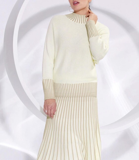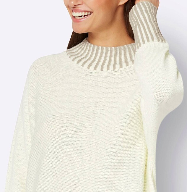 Elegantný a sofistikovaný basic kúsok na mnoho príležitostí! Tento módny horizontálne pletený sveter zo zmesi panenskej vlny má osobitý pôvab vďaka dvojfarebným rebrovaným manžetám na roláku, ako aj na dlhých rukávoch a leme. Príjemne mäkký a teplý vďaka vysokému podielu vlny. Nádherný úplet vyrobený z 50 % vlny / 50 % polyakrylu. Dĺžka 64 cm. Výrobca: AproductZ GmbH, Adresa: Werner-Otto-Straße 1-7, 22179 Hamburg, DE, Email: customer-service@aproductz.com