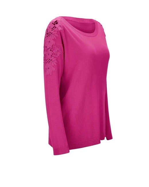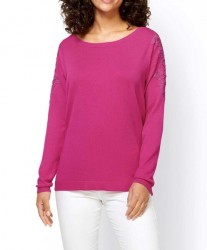 Tento pulóver očarí svojou pôvabnou siluetou a nenútenou jemnosťou. V trendovej ružovej s priehľadným lemovaním z jemnej, kvetinovo vyšívanej čipky na moderných oversized ramenách. Priliehavá silueta s rebrovaným výstrihom, dlhými rukávmi s rebrovanými manžetami a rebrovaným spodným lemom. Dĺžka 64 cm (veľkosť 40). Príjemné na nosenie, nádherne mäkký jemný úplet zo 70% viskózy/30% polyamidu, čipka zo 100% polyesteru.