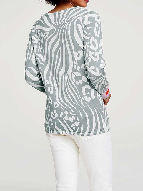 Maximálny efekt, trendy štýl a provokatívne detaily v extravagantnom spojení. Moderný pulóver od Ricka Cardonu so sofistikovanou zvieracou potlačou s ozdobnými cik-cak švami, farebnou aplikáciou hviezd, lesklých kamienkov vpredu a efektne kontrastnými detailmi vzorovej potlače na koncoch rukávov. Priliehavý postave s okrúhlym výstrihom, dlhými rukávmi a rovným spodným lemom.Dĺžka 60 cm (veľkosť 34). Predĺžené vo zväčšujúcich sa veľkostiach, aby vyhovovali postave. Príjemný, mäkký, kvalitný jemný úplet vyrobený z 95% bavlny (Bavlna vyrobená v Afrike)/5% kašmíru.