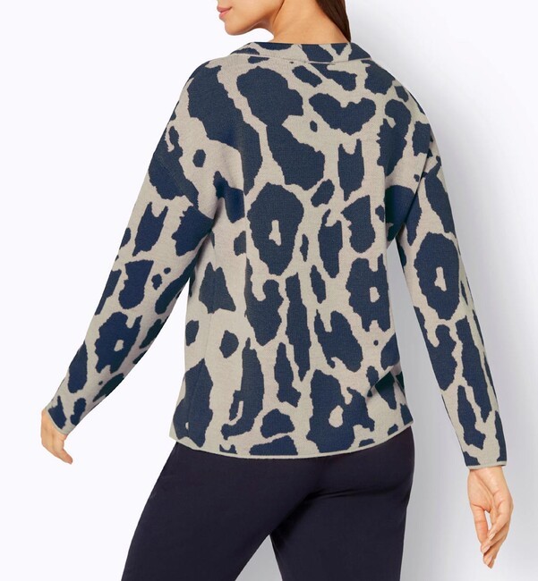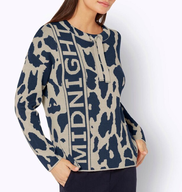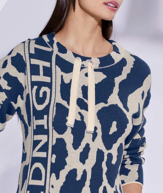 Tento vysoko kvalitný žakárový úplet určite poteší trendsetterky. Trendový nápis na boku a potlač divých zvierat sú presne podľa trendu. Má stojatý golier so sťahovacou šnúrkou a zaväzovaním a dlhé rukávy. Dĺžka 62 cm. Mäkký, pohodlný úplet vyrobený z 50 % polyakrylu a 50 % vlny. Výrobca: AproductZ GmbH, Adresa: Werner-Otto-Straße 1-7, 22179 Hamburg, DE, Email: customer-service@aproductz.com