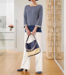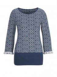 Máte náladu na ničo šik? Potom je tento šikovný sveter módnou nevyhnutnosťou! V dvojfarebnom vzhľade s prepracovaným žakárovým úpletovým vzorom a trendovými, mierne rozšírenými 3/4 rukávmi s rozstrapkanými koncami. Priliehavý postave s okrúhlym výstrihom.dĺžka 65 cm, prepracovaný, mäkký žakárový úplet vyrobený z 95% viskózy / 5% elastanu