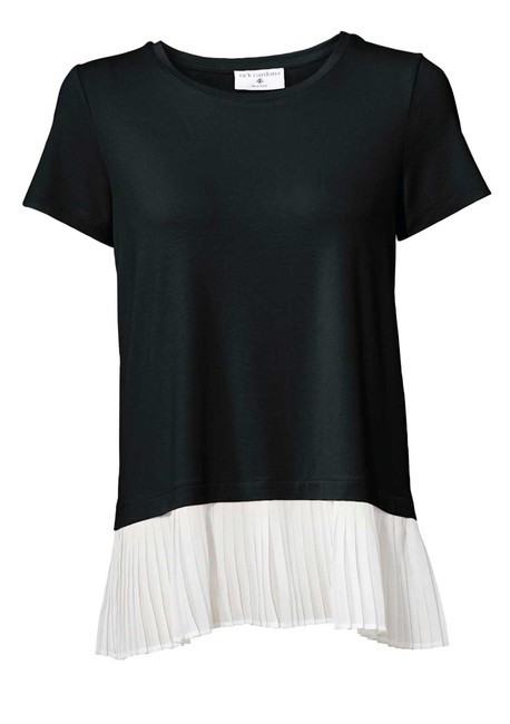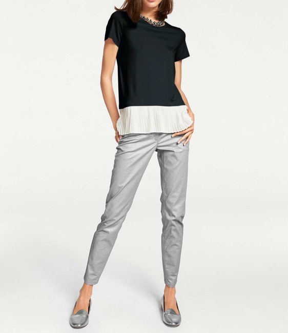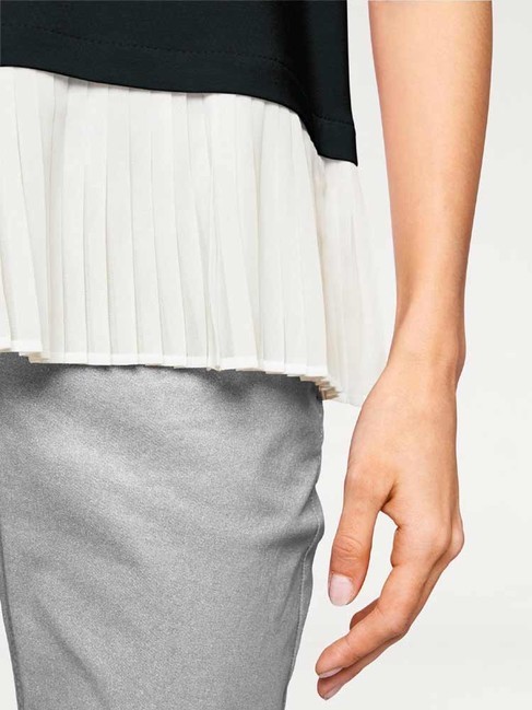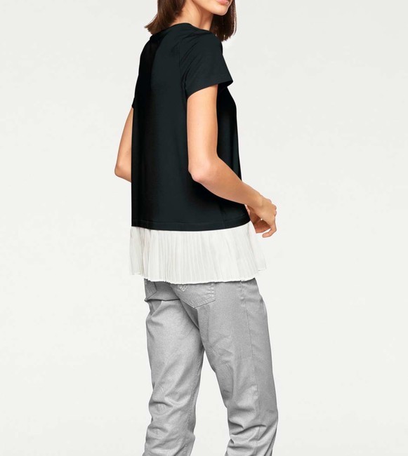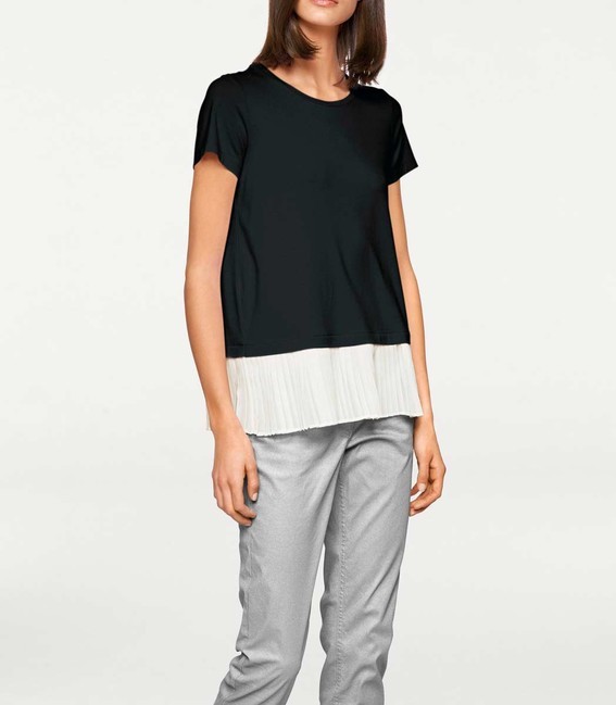 Módne prepracovaný štýl dva v jednom. Rozkošné tričko Rick Cardona s kontrastnou, skladanou vložkou. Úspešná kombinácia príjemného džersej a jemného šifónu. Mierne rozšírený tvar s okrúhlym výstrihom a krátkymi rukávmi. (Bez kvetinových brošní) dĺžka cca 68 cm kvalita mäkkého džersej vyrobená z 95% viskózy / 5% elastánu, vložka vyrobená zo 100% polyesteru