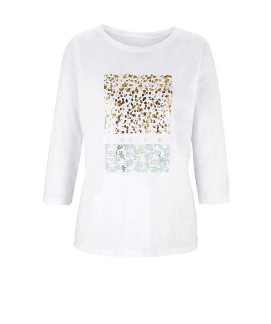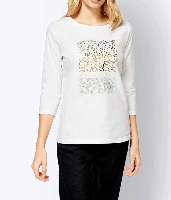 Máte chuť na jednoduchý a rafinovaný kúsok? Potom je toto tričko nevyhnutné vo vašom šatníku! Ležérny favorit s kvetinovou potlačou s nápisom a trblietavým efektom. 3/4 rukávy. Okrúhly výstrih s rebrovaným lemom. Objímanie postavy. Dĺžka 66 cm. Mäkký džersej vyrobený zo 100% bavlny.